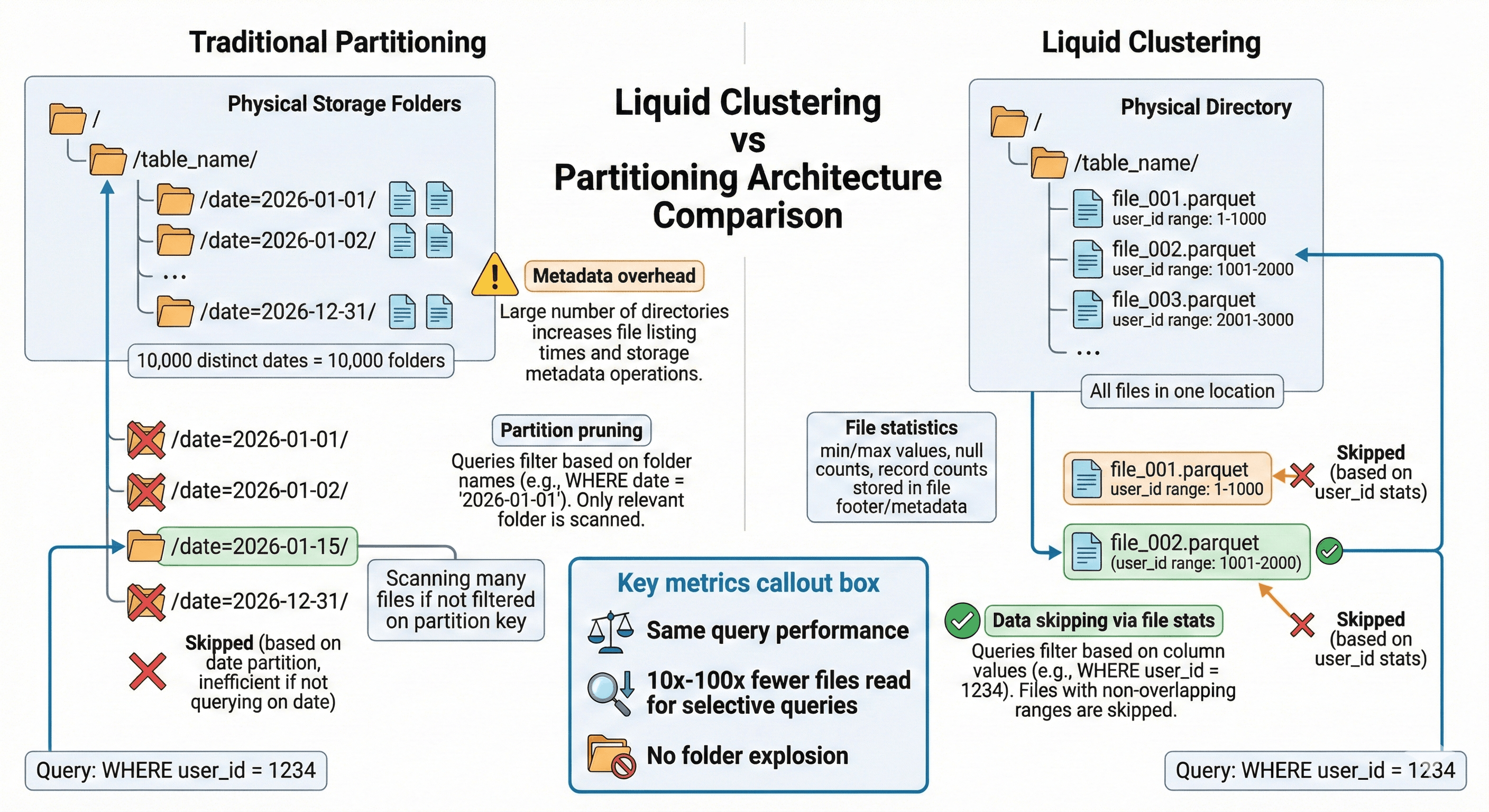 File statistics vs partition pruning: The architectural difference that makes clustering work without folder explosion