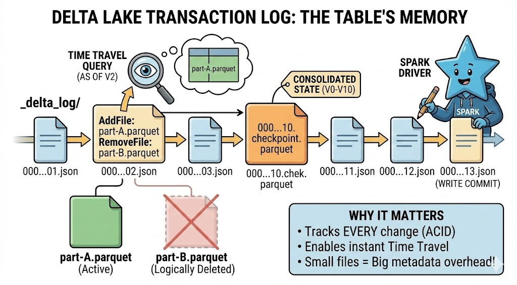 Every Delta Lake table write creates a tiny JSON file in _delta_log/. That 2KB file is why your 10TB table can time travel instantly - and why your table might be slow even with perfect data files.