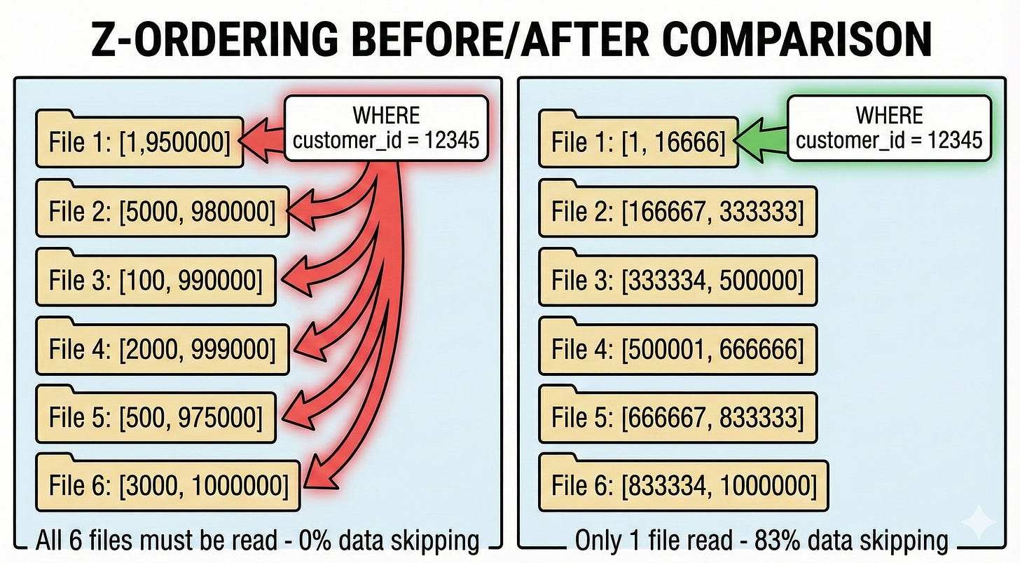 Senior understanding: Without Z-ordering, your data arrives in write order. Customer IDs 1-1,000,000 could be scattered across every file. When you query customer_id = 12345, every file’s min/max range might include it. Data skipping becomes useless.