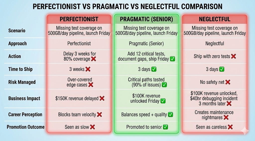 The pragmatic judgment framework that senior engineers use to balance velocity and quality - with 8 real scenarios, decision templates, and a 30-day practice plan