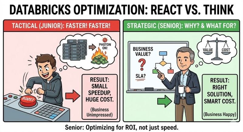 Manager: “Make this Databricks pipeline faster.” Junior Data Engineer adds nodes. Senior asks about business impact. How do YOU approach it?